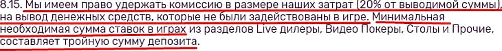 Плутовское казино начинает тянуть деньги даже когда вы еще не начали играть. Заведя деньги на депозит и не прокрутив их в игры-лохотроны, ваши средства уже в размере 20% принадлежат шулерам Алл Райт Казино. А вот чтобы этого не случилось, то нужно три раза открутить в их игроборделе свой депонированный счет.