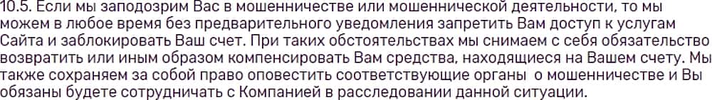 А вот когда шарлатанам Алл Райт Казино становится совсем грустно и алчность переполняет их воровскую душонку, то они могут просто так заблокировать и удалить ваш счет. И для этого, как считают прохвосты Алл Райт Казино, им не нужно никакое обоснование. Достаточно просто прописать этот пункт в своем клиентском антисоглашении.