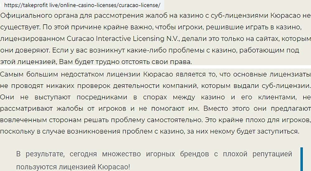 Однако выданное столь мутным лицензиатом разрешение, по информации портала takeprofit live, ставит под сомнение благонадежность псевдоказино All-Right-Casino. Данный ресурс предупреждает, что кроме выдачи своих сертификатов Curacao Interactive Licensing N.V. не занимается ничем, а значит игроки никак не защищены от обмана.