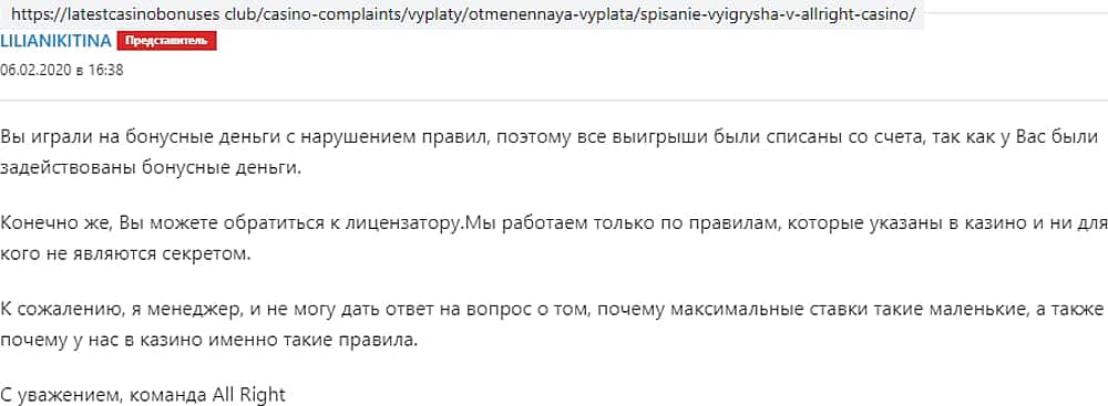 Еще одна вероятная представительница жульнического игросервиса Алл Райт Казино была обнаружена в дискуссиях на веб-портале latestcasinobonuses club. Эта особа от имени лохотронского игропозорища Алл Райт Казино, отбивала нападки обманутых пользователей данного псевдопроекта. В подписи видно, что действует она от имени аферистов: