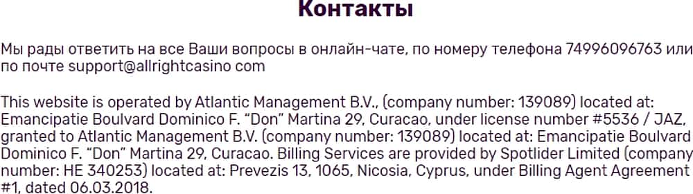 О своей паршивой конторке, игорные обманщики поведали не очень много. Адрес в оффшорном государстве Кюрасао, электронная почта и единственный номер телефона. При том, что мошенники азартного мира располагаются далеко от России, телефон почему-то указан стационарный в Москве. Вот контактные данные жуликов All-Right-Casino: