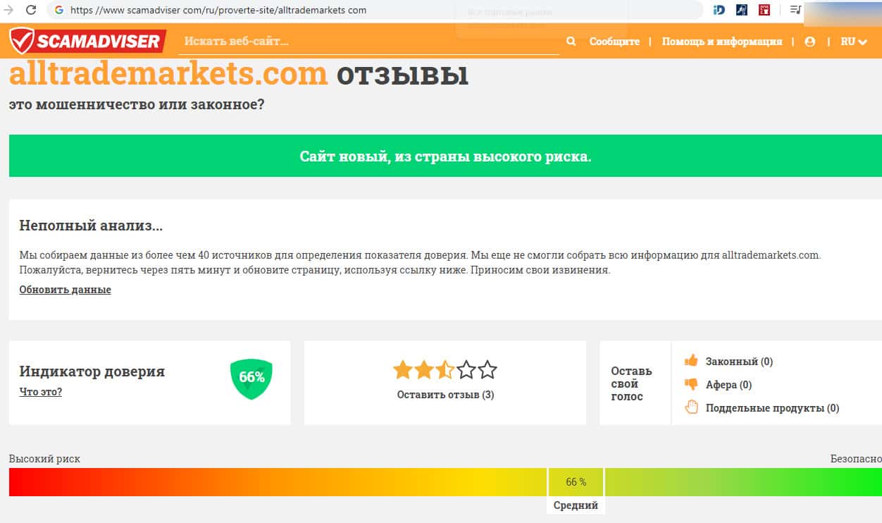 Согласно информации с уважаемого интернет-портала махинаторский форекс дилер AllTradeMarkets расположен на новой интернет-странице из страны высокого риска. Индикатор доверия средний и составляет 66 %. В общем, судя по этим сведения, данный брокер является просто обыкновенной фиктивной брокерской шарагой, которой нельзя доверять.
