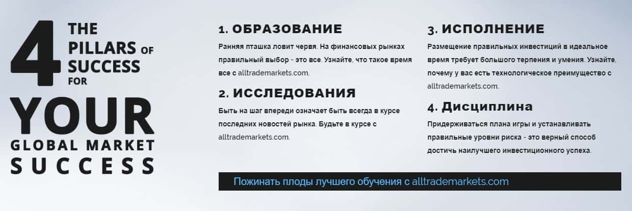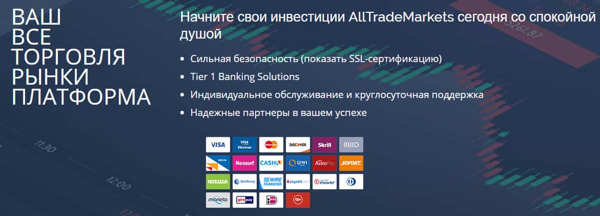 Заканчивается же веб-портал AllTradeMarkets совершенно стандартно, а именно призывами воровского биржевого брокера к трейдерам, якобы они предоставляют такие преимущества в работе с ними: круглосуточная поддержка; надежные партнеры; сильная безопасность; индивидуальное обслуживание и Tier 1 Banking Solutions. По факту, это сплошное вранье.