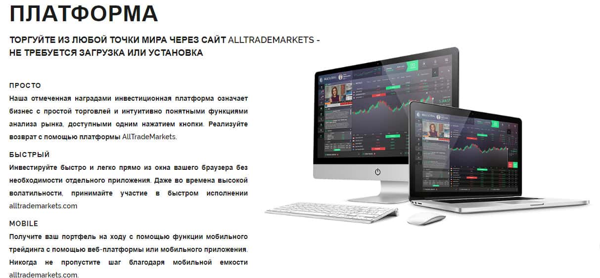 Кроме торговой платформы, жульнический форекс дилер AllTradeMarkets решил задействовать еще и тяжелую артиллерию в виде отдельно созданной инвестиционной платформы. Аферюги уверяют, что их бизнес-модель основана не на высоких сборах, комиссиях и спредах, а скорее на успехе форекс трейдеров, на которых основан доход. Лохотрон очередной, одним словом.Лохотронская форекс организация AllTradeMarkets втюхивает подставную торговую платформу вкладчикам