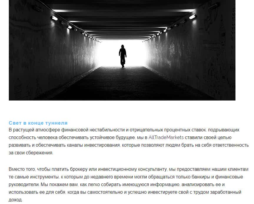 Двигаясь по интернет-ресурсу аферной форекс организации AllTradeMarkets мы попадаем в раздел, посвященный тому, что данная шарашкина контора разработала грандиозный финансовый проект с целью поставить умных людей на свой путь к финансовой свободе. По факту, если Вы рискнете начать свое сотрудничество с ними, то Вы лишитесь денег.
