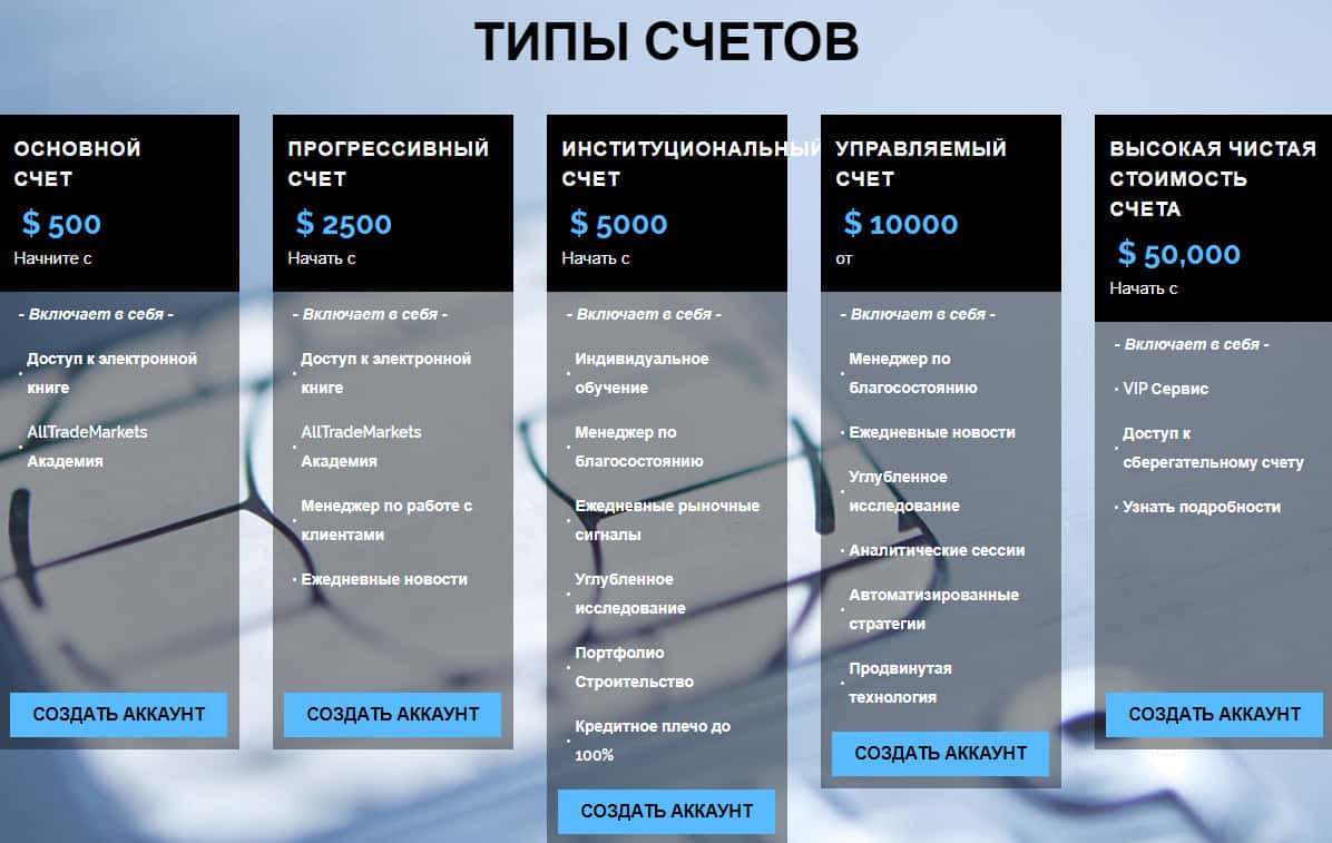 На следующем изображении красуются типы счетов, которые предлагает потенциальным вкладчикам надувательский биржевой дилер Алл Трейд Маркетс: основной, прогрессивный, институциональный, управляемый и высокая чистая стоимость счета. Различие этих счетов состоит в порядке возрастания от суммы, на которую обдерет клиента, как липку лжедилер AllTradeMarkets.