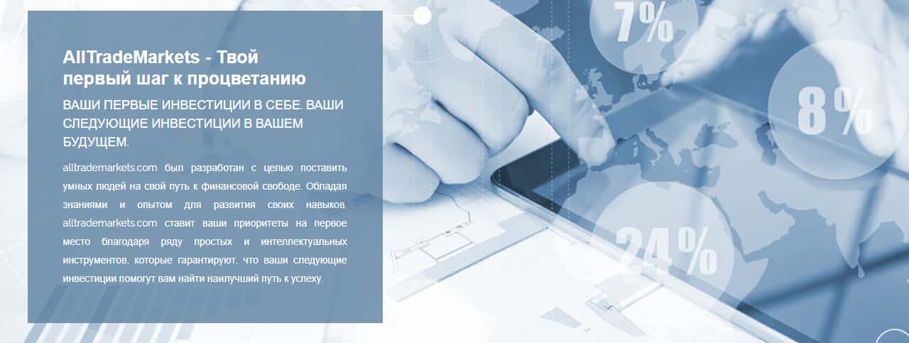 Начинается интернет-площадка у надувательского валютного брокера Алл Трейд Маркетс вполне стандартно и предсказуемо, где они рассказывают, что любой биржевой игрок сможет покорить торговый ранок благодаря сотрудничеству с ними. Их слоган: "Великие идеи имеют решающее значение. Современные исследования гарантируют, что Вы принимаетелучшие решения".