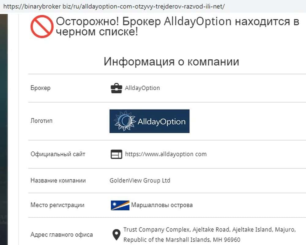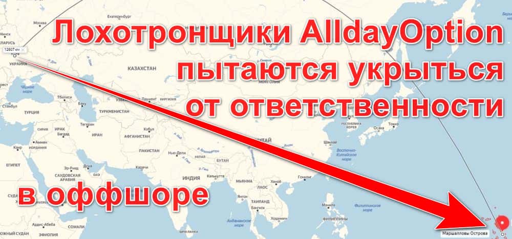 Может показаться, что разводилы AlldayOption находятся в Болгарии - так они указывали на своем сайте. Но адрес в Софии фейковый, а проект находится в управлении конторы GoldenView Group Ltd, офис которой находится по адресу Trust Company Complex, Ajeltake Road, Ajeltake Island, Majuro, Republic of the Marshall Islands, в оффшоре.