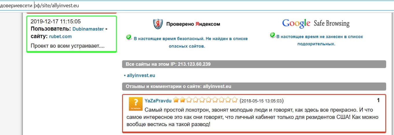 Пользователь с ником Язаправду оставил на сайте Довериевсети комментарий о том, что брокер Ally - самый заурядный развод и лохотрон. Менеджеры фирмы звонят по телефону и начинают уговаривать зарегистрироваться на из сайте. Обыкновенные лохотронщики, ничего нового, обычная схема, какой пользуются все подобные шарашки.