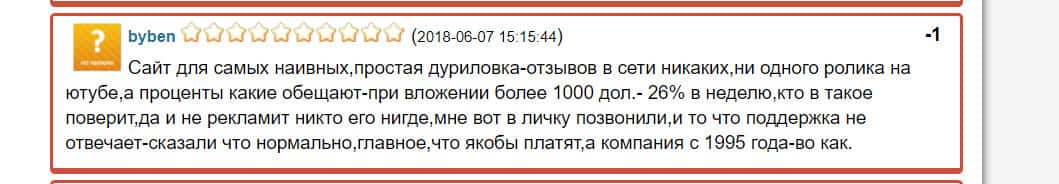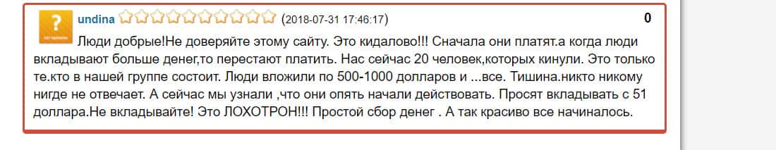 - Сайт для самых наивных простачков, обычный скам-проект с высокими процентами - считает автор отзыва на сайте Довериевсети