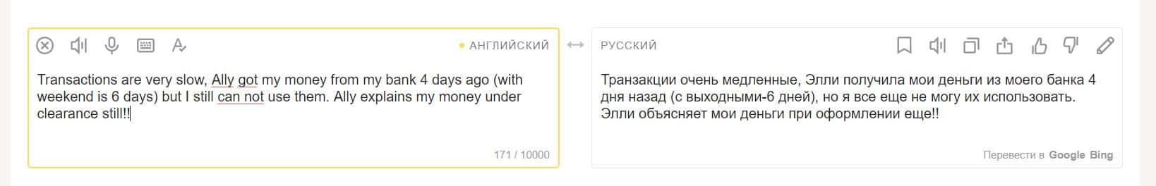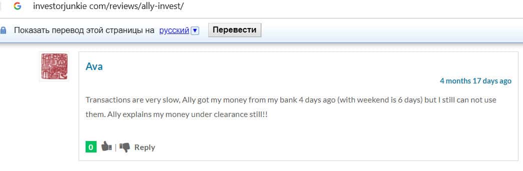 Многие иностранные трейдеры, знакомые с мошеннической конторой Ally,недовольные ее работой. Люди жалуются на очень медленные транзакции, которые осуществляет компания. Об этом говорит отзыв от Ava, с сайта investorjunkie com.