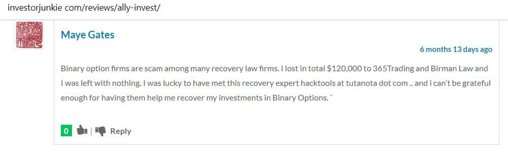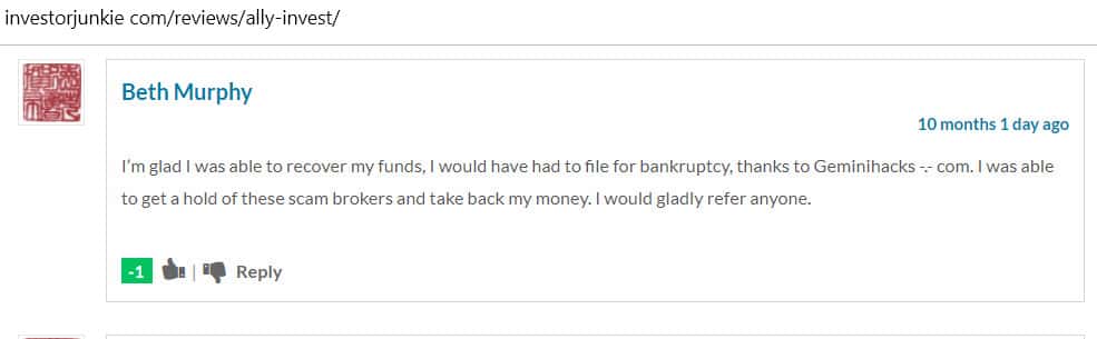После того, как клиент Ally Investостался ни с чем, он обратился в фирму, предоставляющую услуги чарджбека, и только тогда смог получить свои вложенные средства.