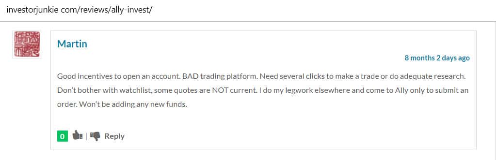 Мартин оставил негативное сообщение о компании Ally на сайте investorjunkie com. Сначала организаторы брокерской конторы стимулируют вас начать торговать на бирже, обещая высокую прибыль и выгодные условия. Но, когда вы занимаетесь трейдингом, вы понимаете, что здесь нет адекватного обслуживания.