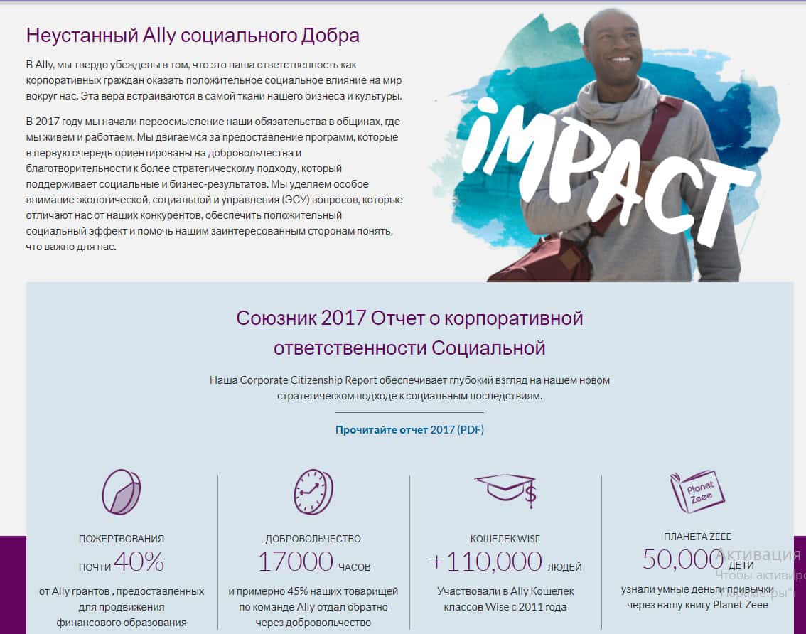 Владельцы Эллай напичкали свой сайт разной бесполезной информацией, призванной пустить пыль в глаза простым людям, чтобы произвести эффект щедрой и надежной компании. Например, чего стоит раздел Социальное влияние с улыбающимся афроамериканцем посредине, видимо, получившим кредит в Ally Invest. Компания заявляет о многочисленных пожертвованиях и помощи всем, кому только можно.