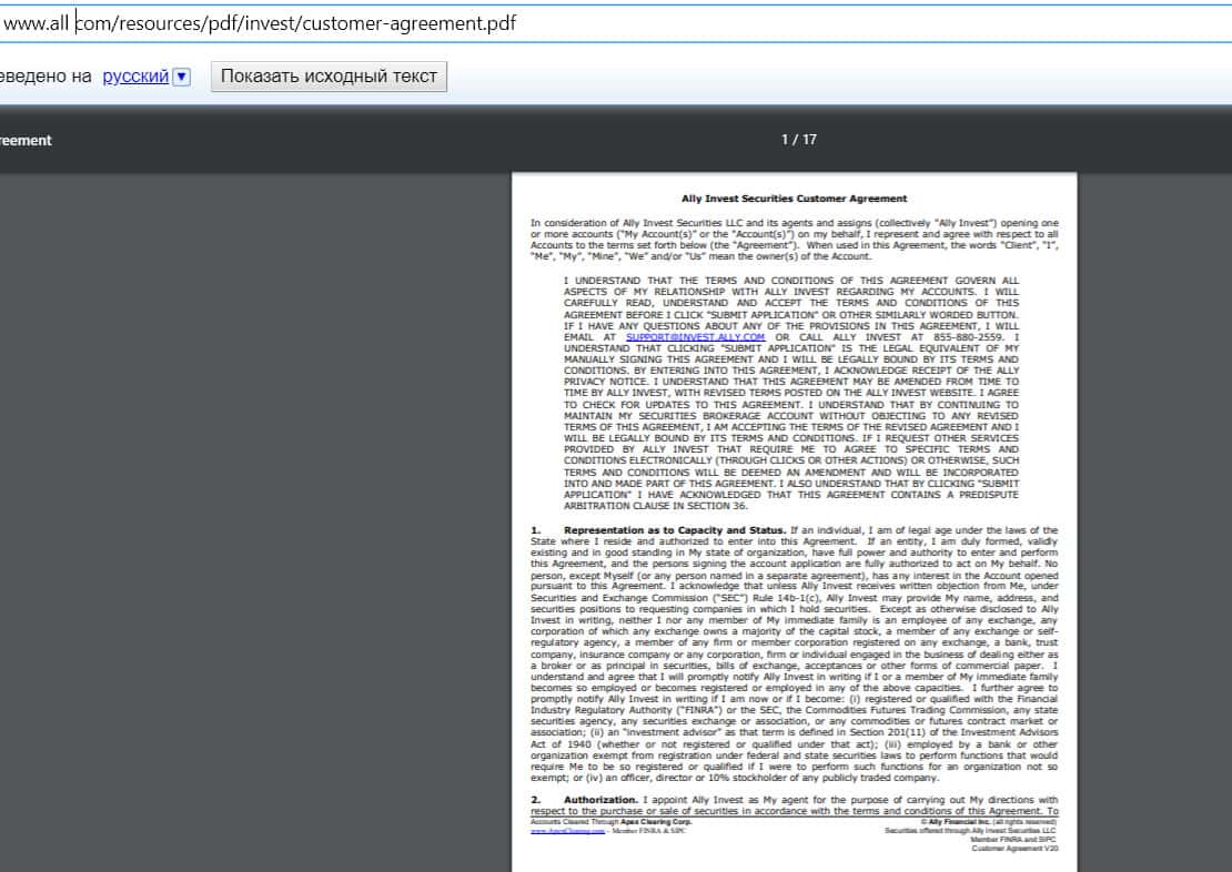 Он-лайн банк, которому принадлежит брокер Эллай, является крупной финансовой организацией Америки, поэтому он имеет множество документов, регулирующие отношения вкладчика и компании. К ним относится и клиентское соглашение, но оно доступно только в англоязычном варианте.