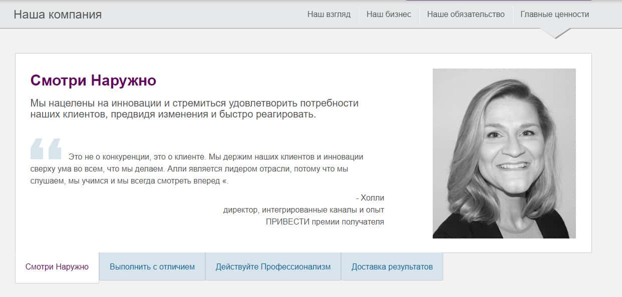 На сайте ally com нет никакой информации о ее руководителях. Это странно, если учесть, что Ally Bank - очень известная финансовая организация в Америке. Раздел Наша компания заполнен всяческими лозунгами о том, какие они хорошие и надежные. В самом низу размещена одна фотография с подписью Холли - директор, интегрированные каналы и опыт. На самом деле непонятно, кем является эта женщина.