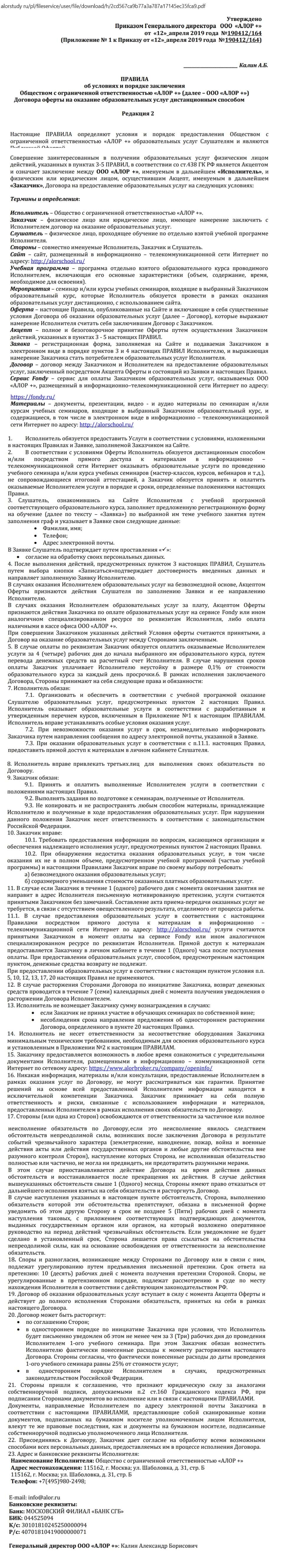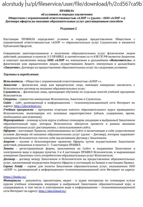 Вот полный текст договора, представленного на сайте мошеннической конторы Алор Скул.