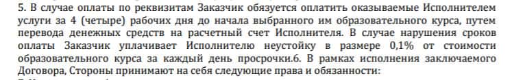 В пятом пункте оговариваются условия и сроки оплаты образовательных услуг он-лайн школы Алор Скул.