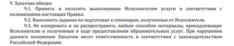 В пункте 9 мы можем прочитать об обязанностях клиента по отношению к организации Алор Скул.