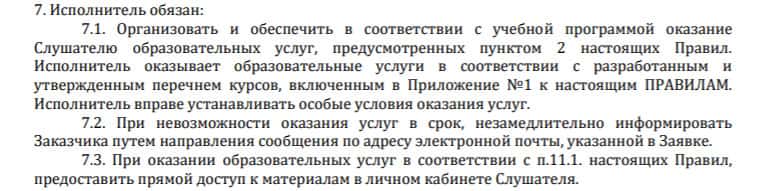 Дальше создатели он-лайн школы Алор Скул описывают свои обязанности по отношению к клиентам.