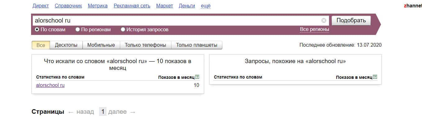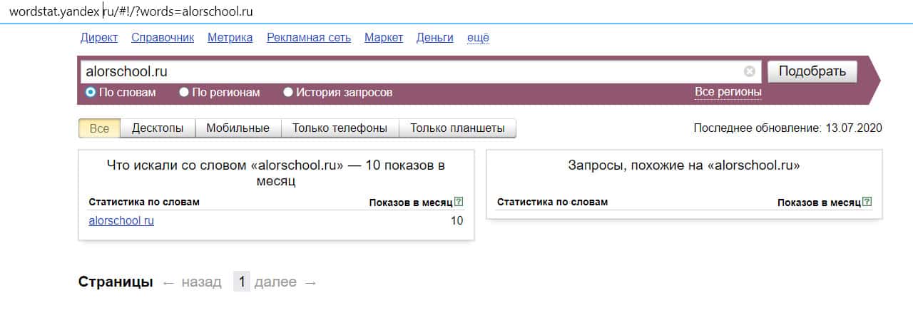 Проверим, какой результат будет по запросам доменного имени "alorschool ru", написанного без точки. Данные проверки аналогичны: очень мало запросов.