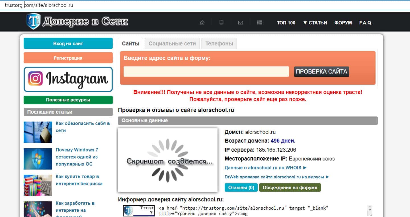Как видно из информации, полученной с сервиса Трасторг, домену alorschool ru 496 дней. то есть, мошенники создали относительно недавно.