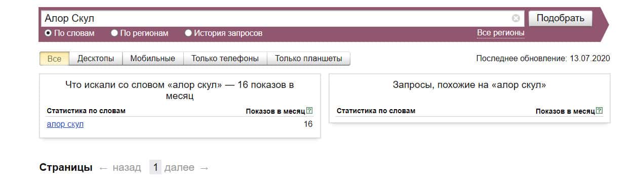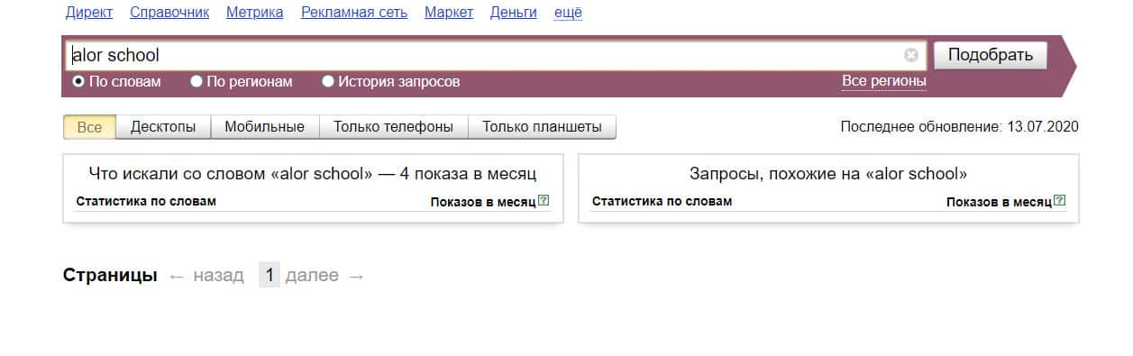 Посмотрим, сколько раз пользователи хотели найти контору "Алор Скул" на русском языке. Результат не впечатляет - всего 16 показов за целый месяц.