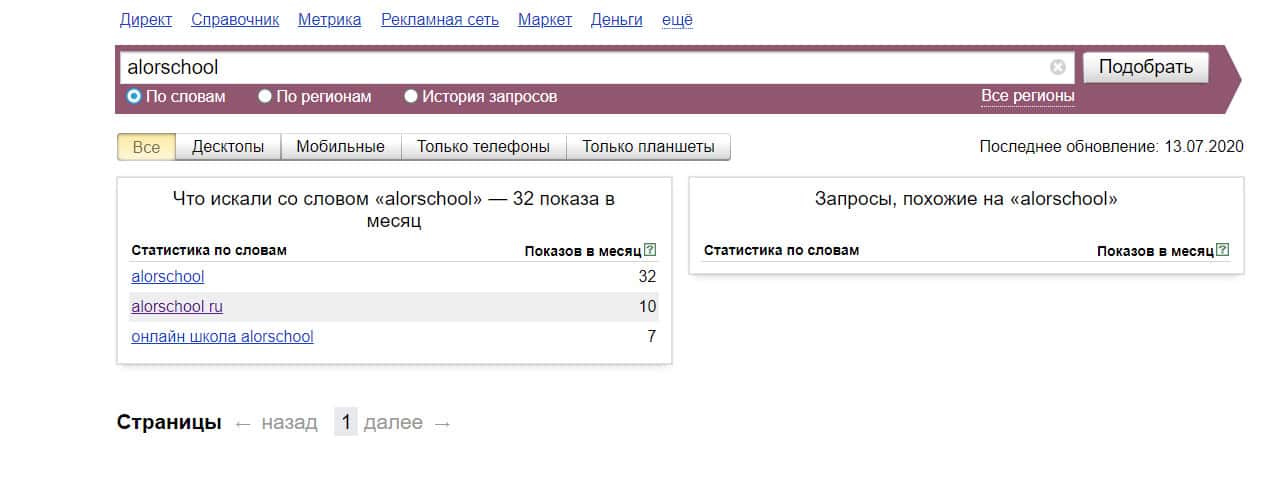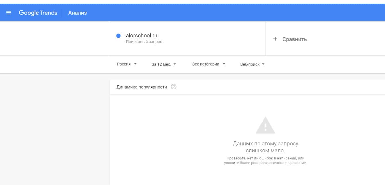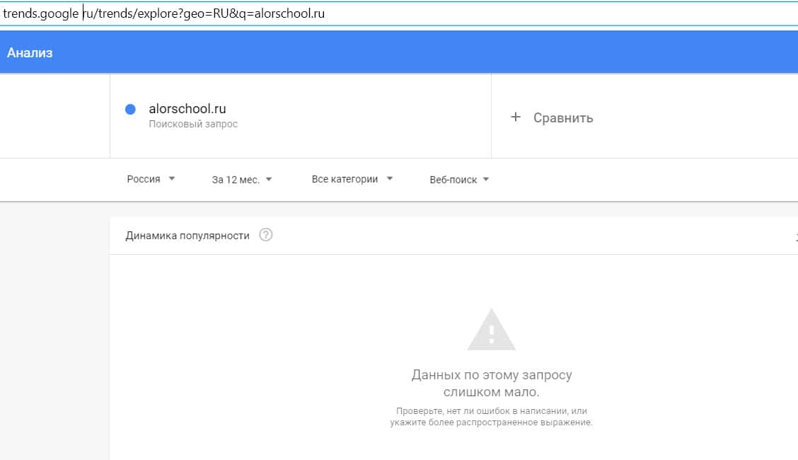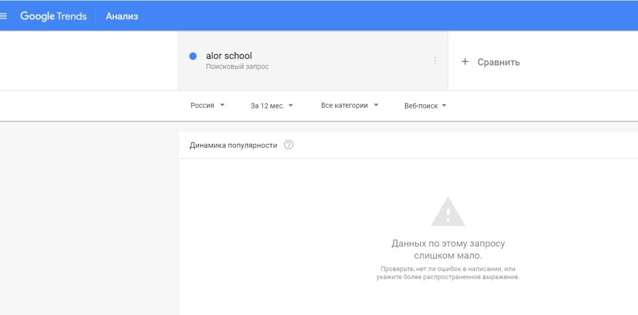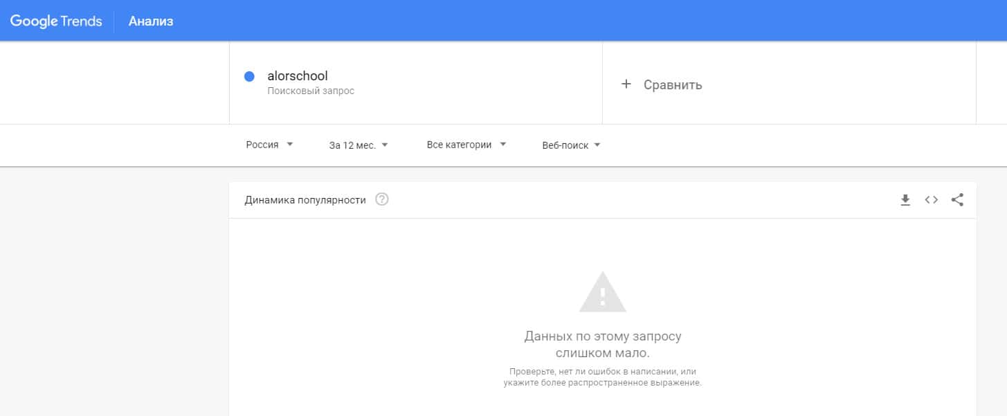 Проверка по бренду "alorschool" на английском языке без пробелов показывает результат, аналогичный предыдущим: очень мало данных для обработки запроса.