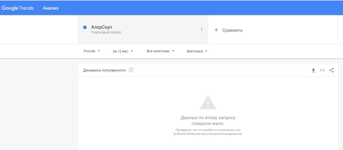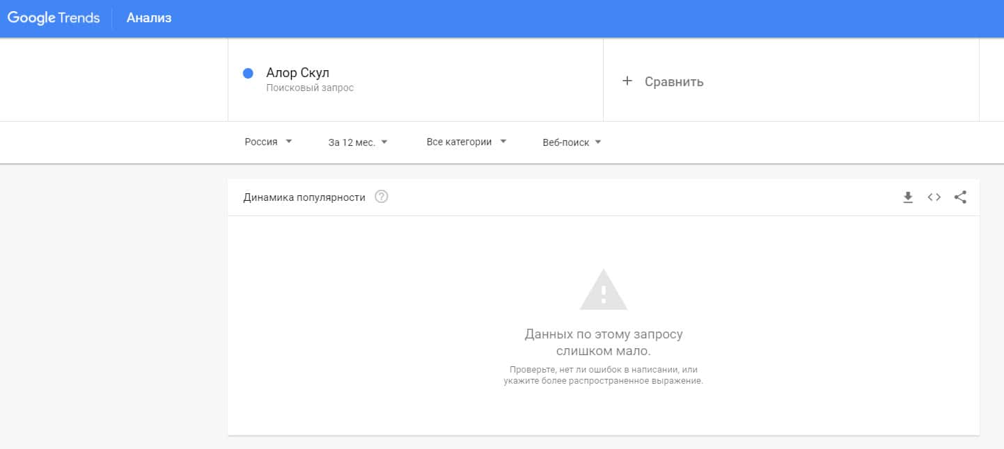 В поисковой системе Гугл домен мошеннического сайта "alorschool.ru", вбитый в строку с точкой искали крайне редко, как показал сервис Гугл Тренд.
