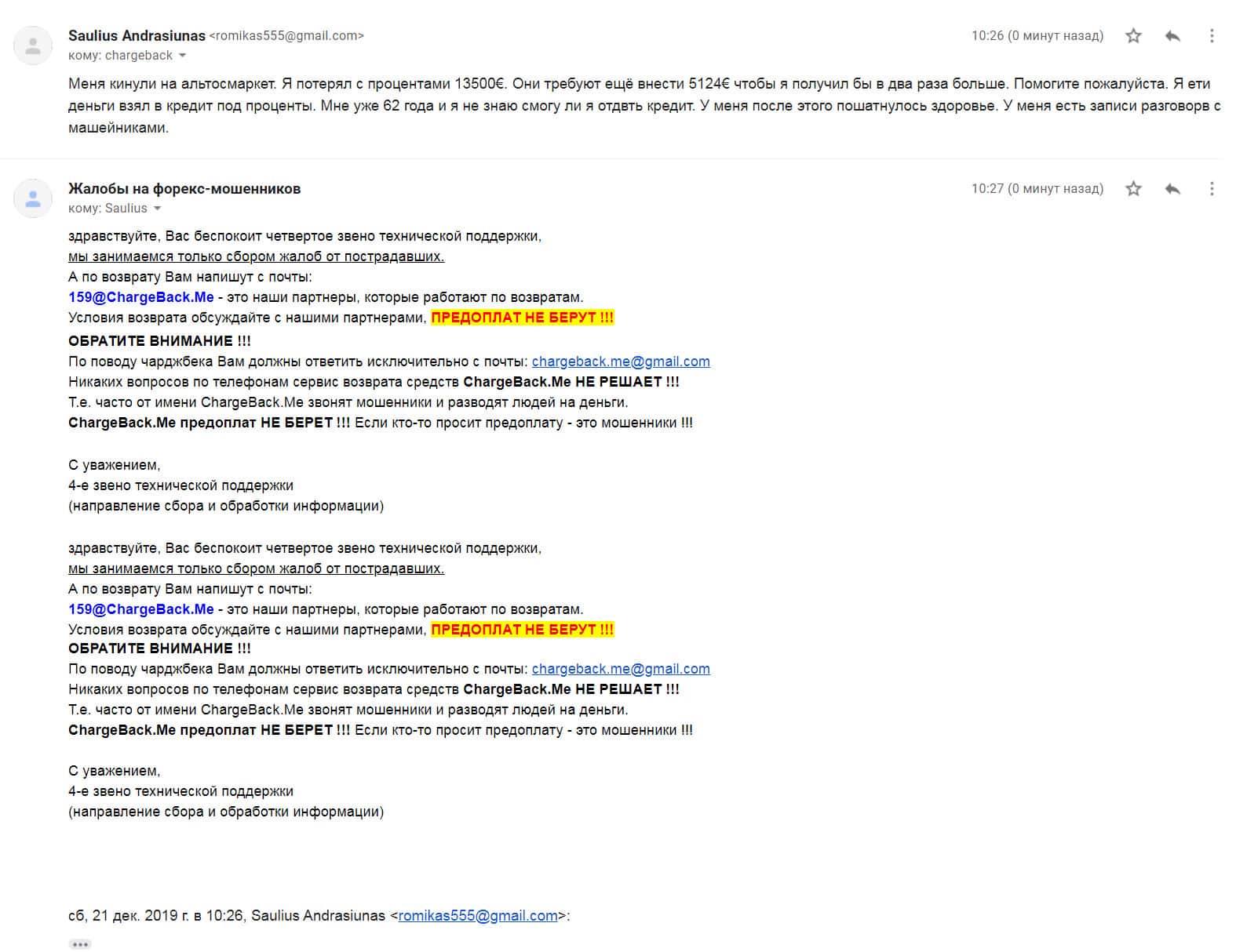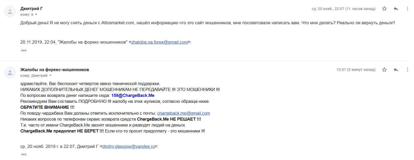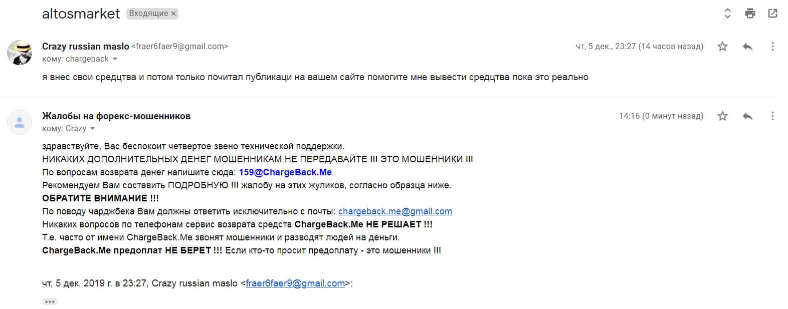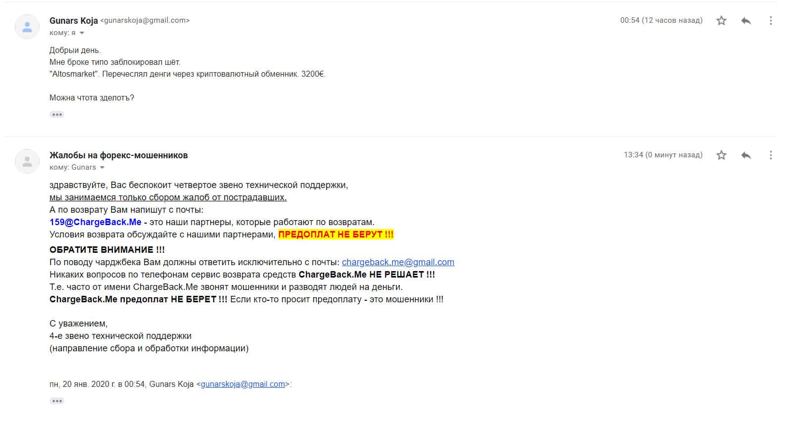 Еще одного человека обманула скам-контора ALTOSmarket. Мужчине написали на почту мошенники, и уверяя его в том, что он получит горы золота, заставили вложить некую сумму денег. Первое время всё шло хорошо, но, когда жертва заговорила о выводе, шулеры сразу же перестали выходить на связь и пропали, забравши с собой 13500 евро пострадавшего.