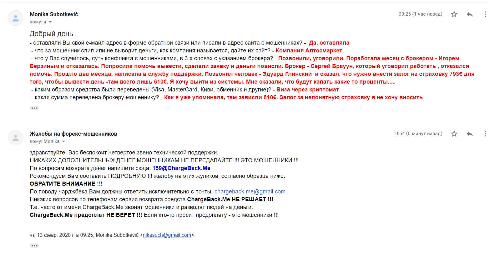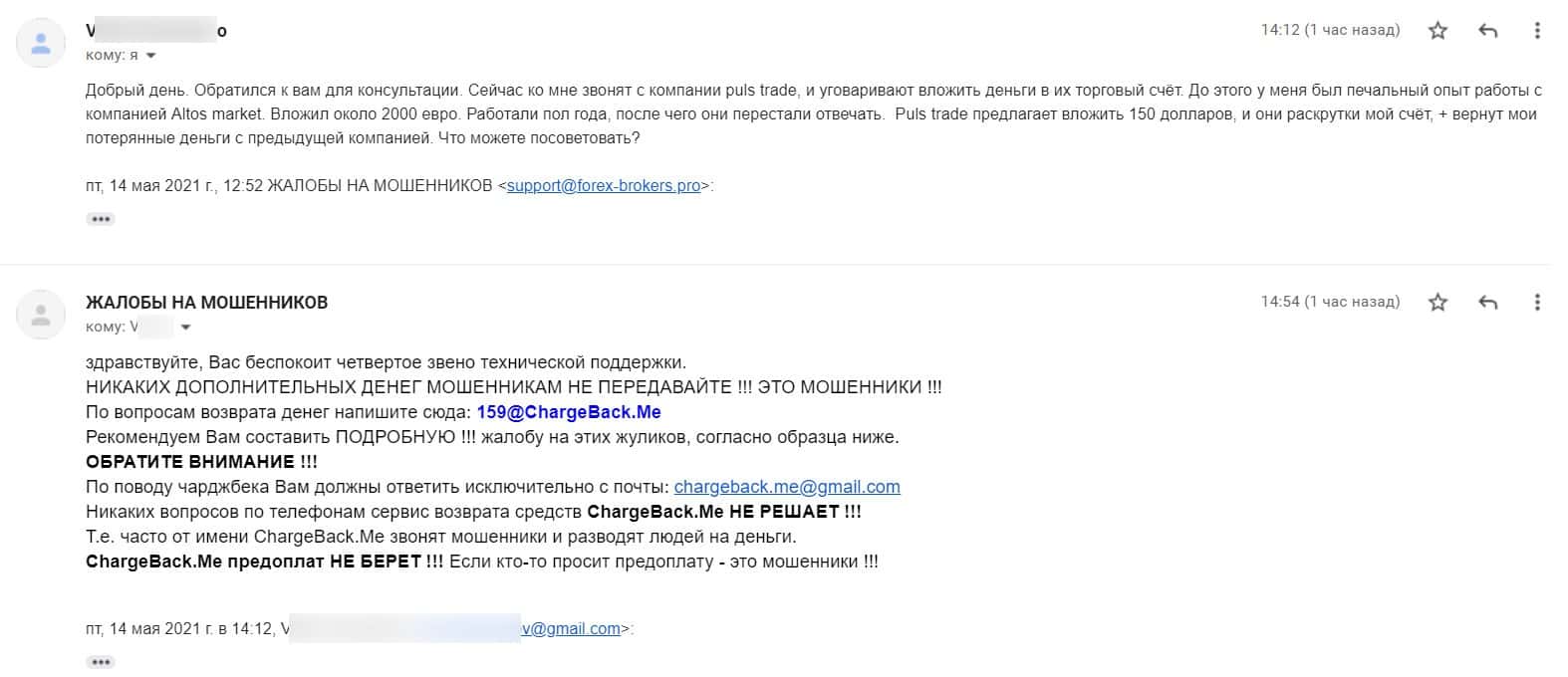 Далее предоставлена жалоба на мошенническую организацию Альтос Маркет, которая работая в одной связке с Puls Trade кинули клиента на 2000 евро.