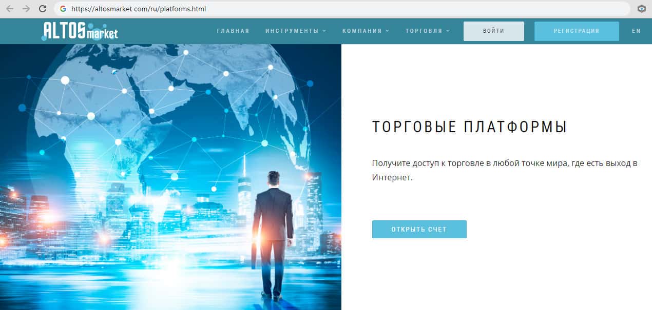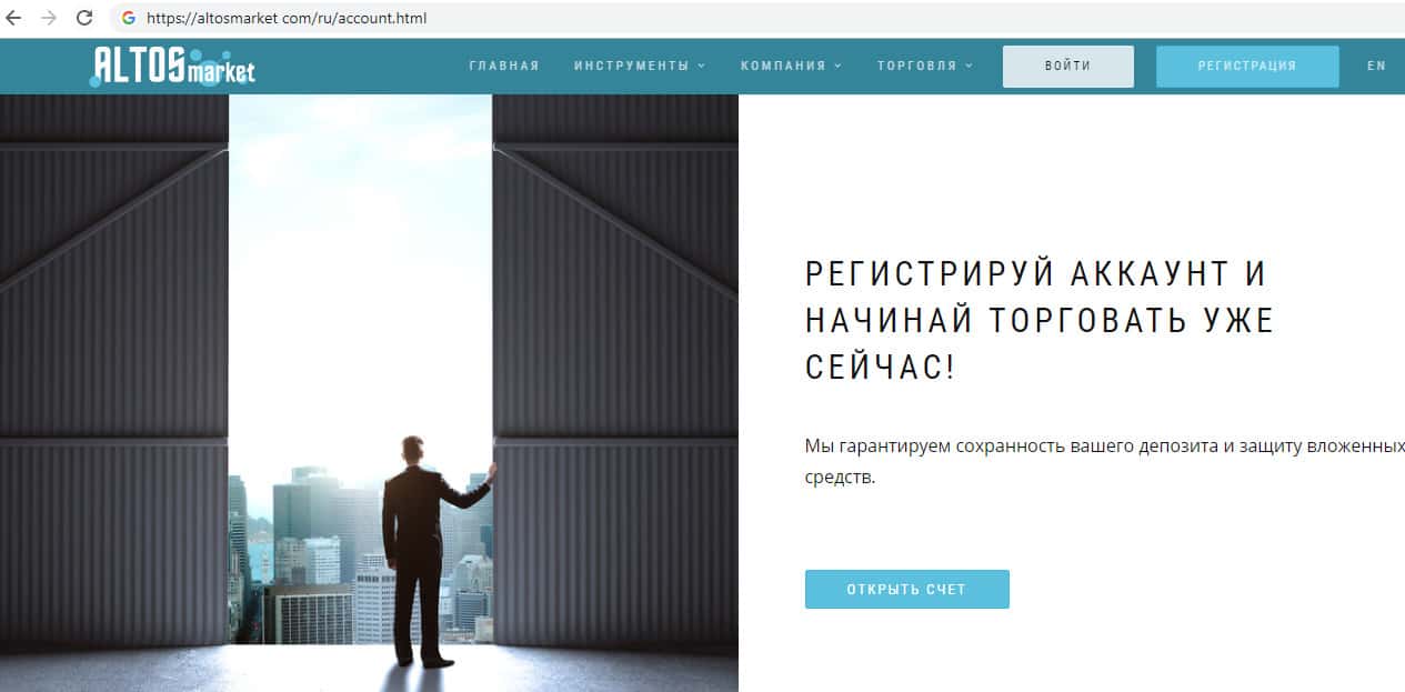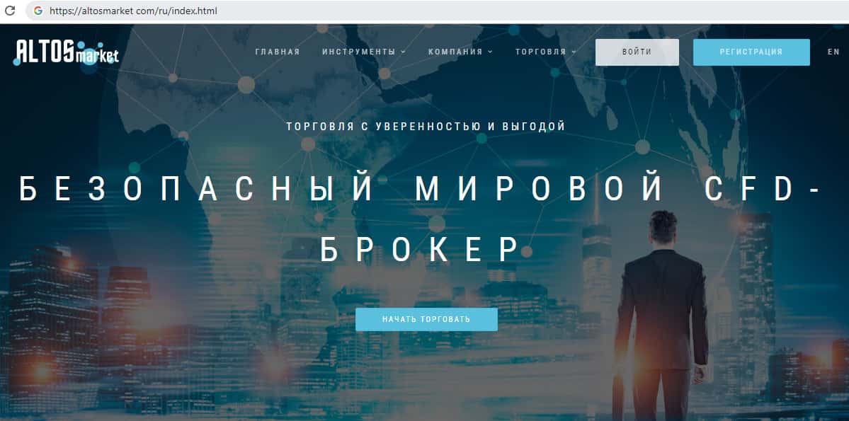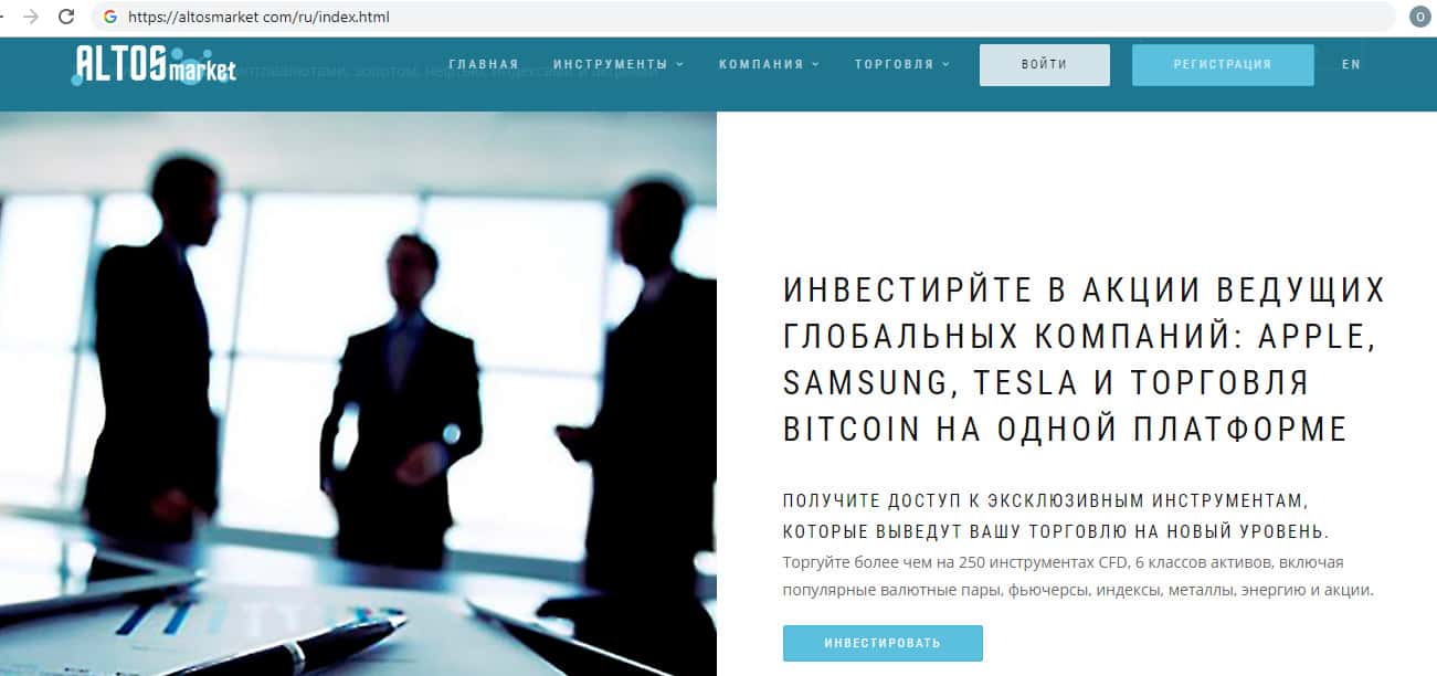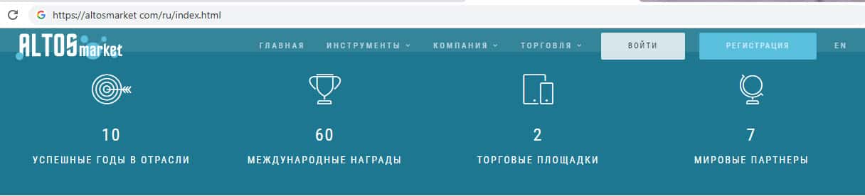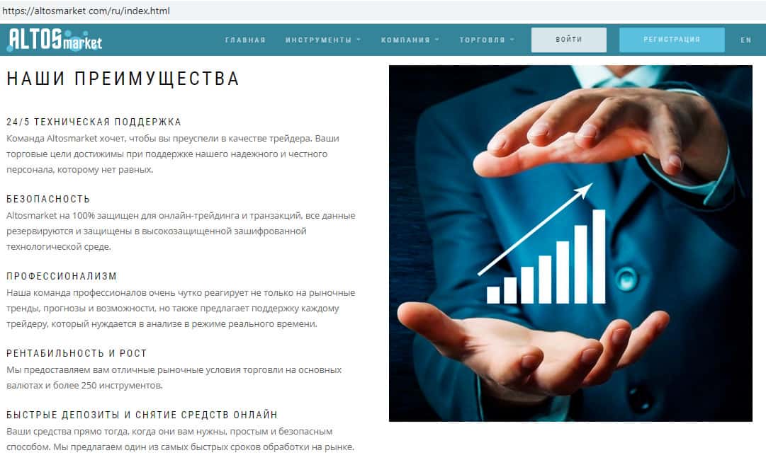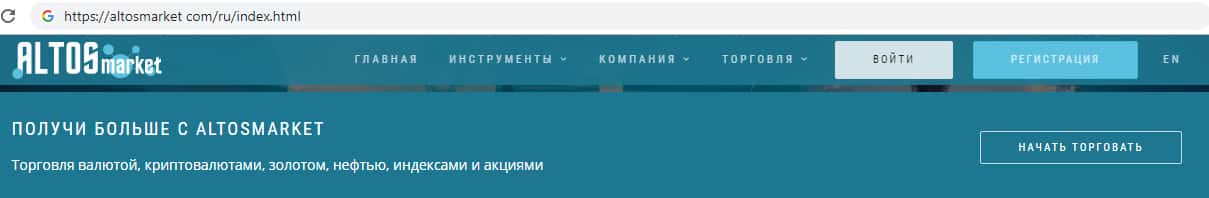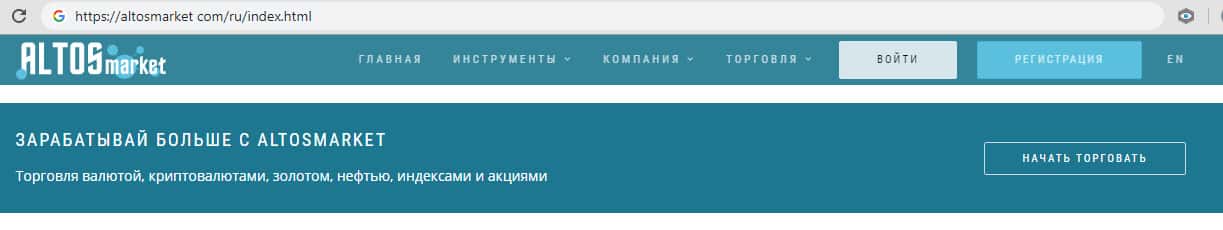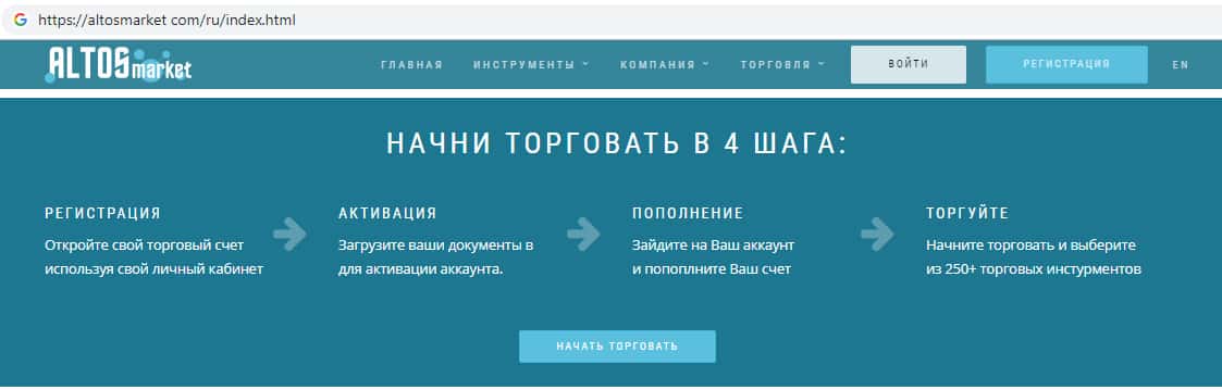 Главная страница портала Альтос Маркет встречает своих посетителей ярким, но не слишком вызывающим дизайном, смелыми заявлениями о своих достижениях, рекламными слоганами и предложением,не мешкая, пройти регистрацию и пополнить ряды трейдеров CFD-брокера Альтос Маркет, то есть стать на путь потери своих сбережений.