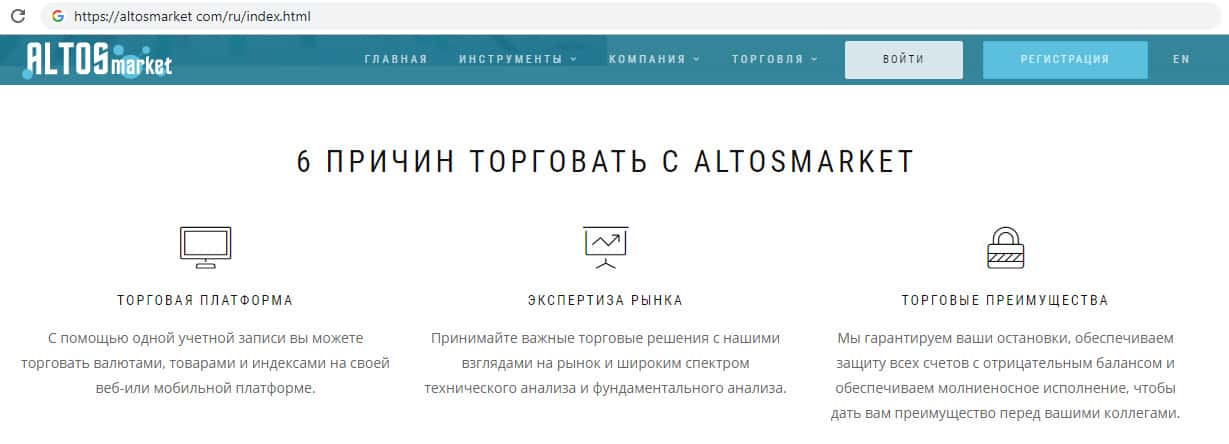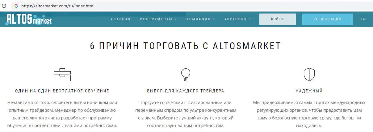 Опускаясь по странице, сумбурность рекламы исчезает, ей на смену приходит прагматичный и структурированный подход. Администрация Альтос Маркет начинает знакомить посетителя сайта со своими преимуществами и предлагает ознакомиться с шестью причинами, побуждающими, по их мнению, трейдера выбирать именно Альтос Маркет.
