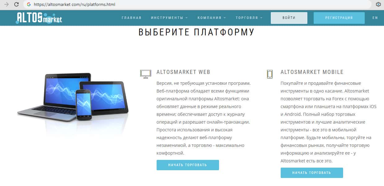 Веб-платформа не требует установки и обладает всеми функциями оригинальной платформы Altosmarket. Также предлагается платформа для мобильных устройств, работающих под управлением операционных систем iOs и Android. Получить дополнительные сведения об этих приложениях не представляется возможным, пока не пройдешь регистрацию на портале Альтос Маркет.