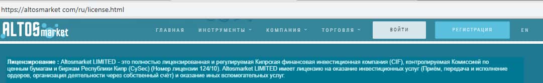 Нижняя часть каждой страницы портала Альтос Маркет содержит заявление о том, что брокер Альтос Маркет ни кто иной, как Кипрская инвестиционная компания с лицензией по номером 124/10 Комиссии по ценным бумагам и биржам Республики Кипр. Altos Market Limited имеет лицензия на оказание брокерских и иных инвестиционных услуг.