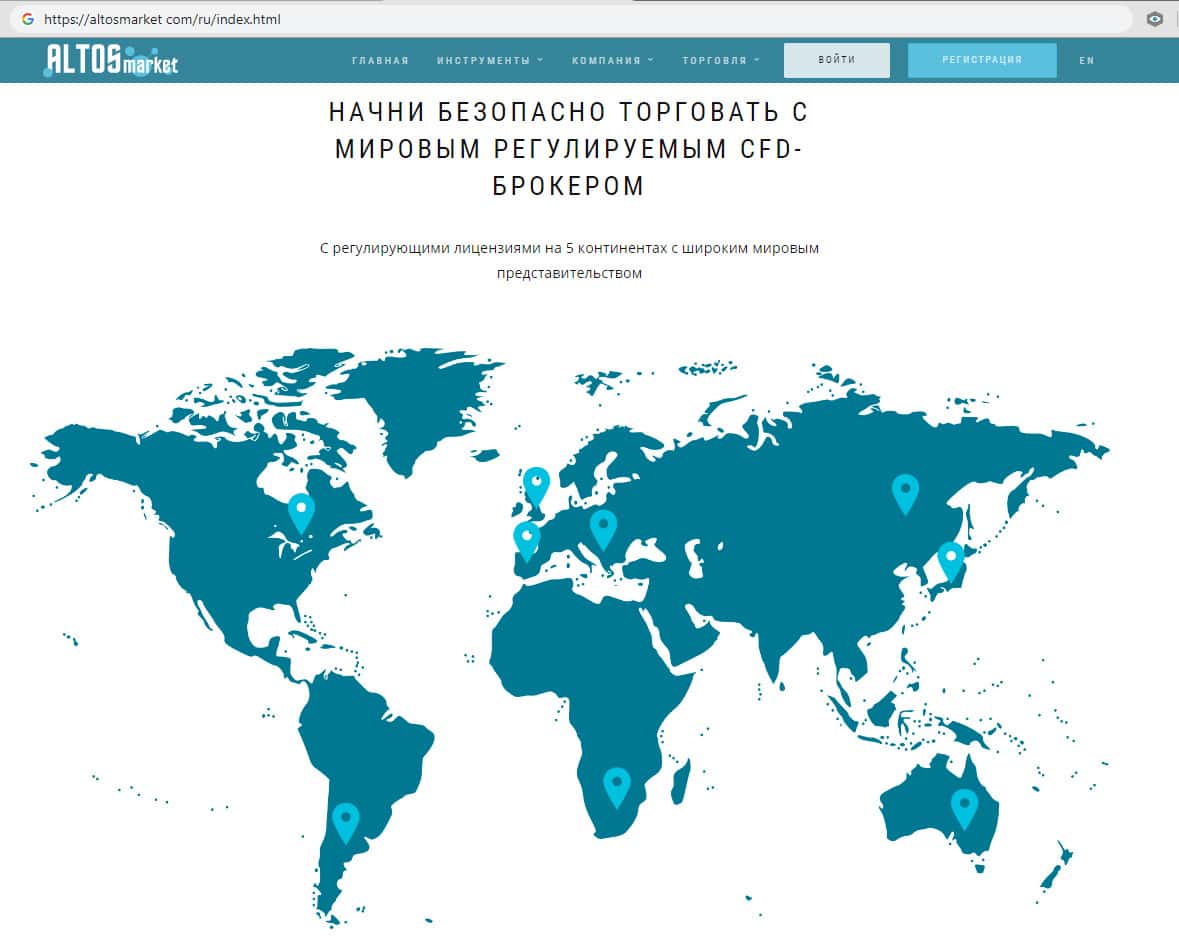 Решив проверить данную информацию, мы обнаруживаем, что никакой Altos Market Limited в Республике Кипр никогда не регистрировалось. Регистрация мирового брокера с регулированием брокерской деятельности на пяти континентах фантазия мошенников, её придумавших.