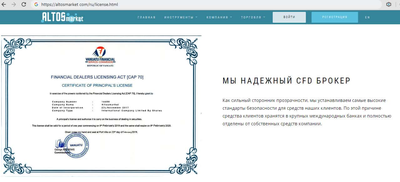 В разделе портала Альтос Маркет, посвященному лицензированию его брокерской деятельности красуется фотография лицензии компании Altosmarket, выданная в Республике Вануату в ноябре 2017 года сроком на один год на период с 9-го февраля 2019 года по 8-е февраля 2020 года. А как же десять лет истории супер брокера Альтос Маркет?