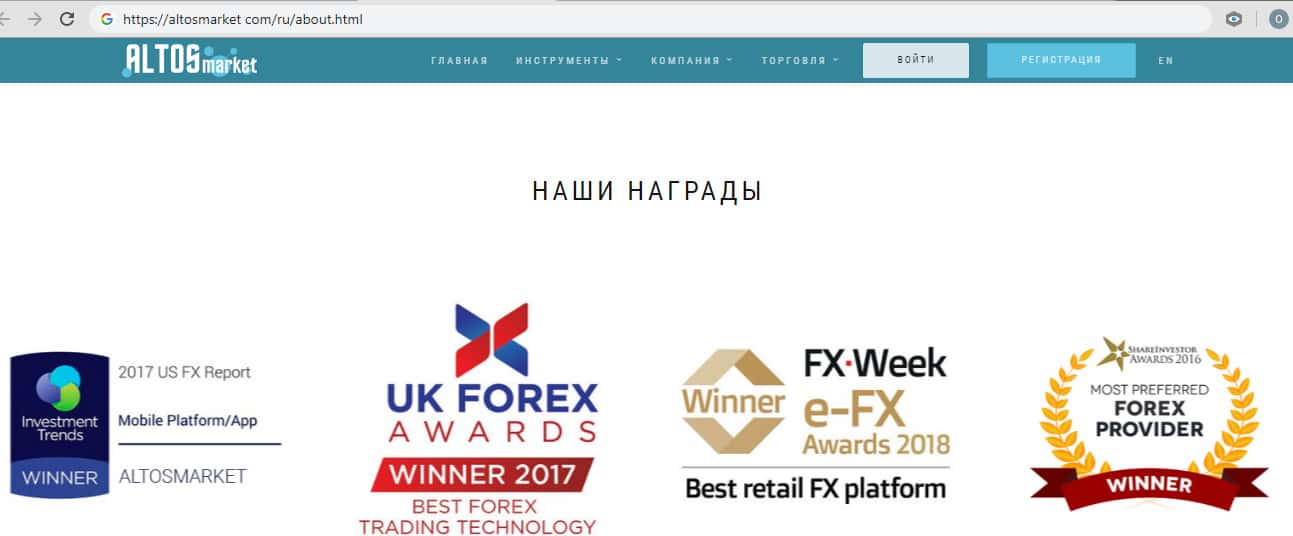 В желании пропиарить свою контору трудно отказать администрации портала Альтос Маркет. Какие порой заявления не делают мошенники, что бы привлечь наивного клиента. Возраст проекта увеличили по крайней мере вдвое, приписали сразу целый сонм несуществующих наград, широкое международное сотрудничество.