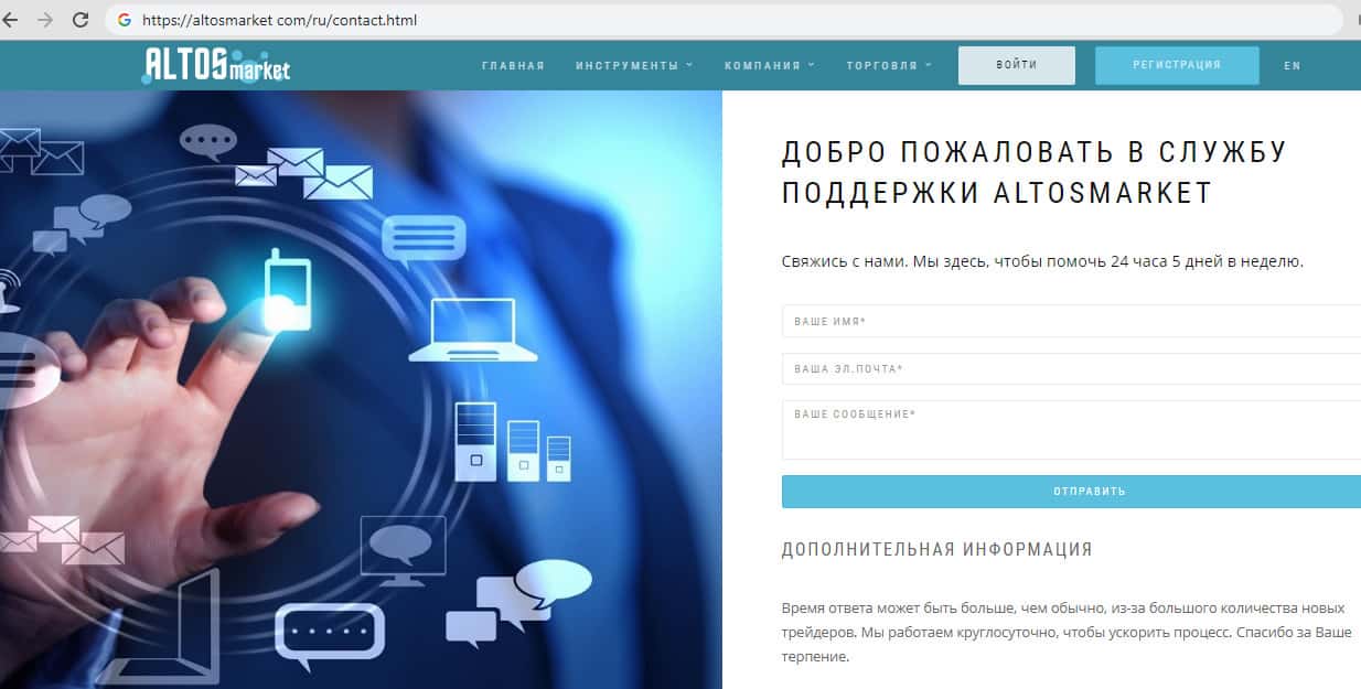 Проведя полный обзор сайта Альтос Маркет, рассмотрев его "лицензии", и открыв страницу с контактной информацией, уже нет желания проверять ответит ли техническая поддержка Альтос Маркет или нет. Кроме формы обратной связи, других контактных данных мировой брокер увы не имеет, а время ответа может затянуться всвязи с большим количеством новых трейдеров.