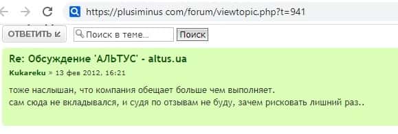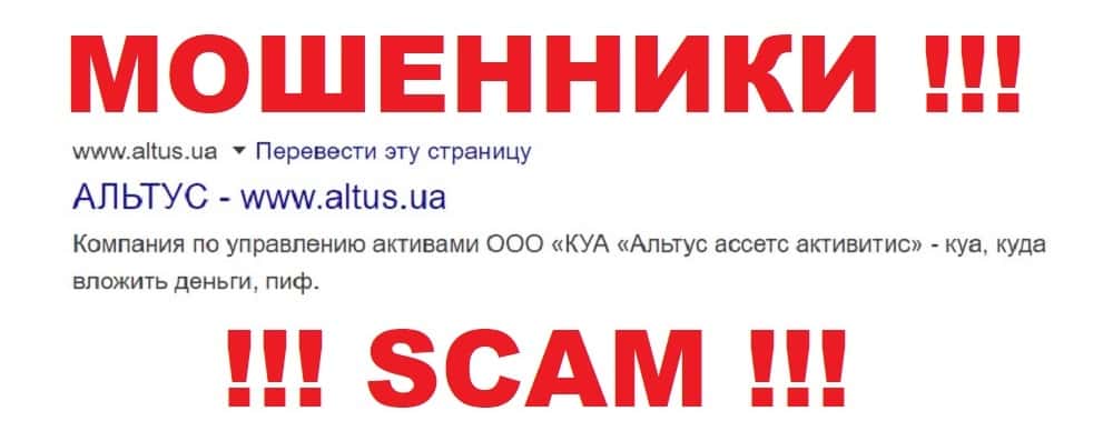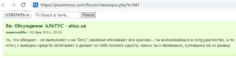 Недовольный пользователь программы по управлению инвестициями Альтус Ассетс Активитис (Altus Uа) на финансовом форуме plusiminus com отмечает, что мошенники из этой конторы не выполняют свои обещания, затягивают вывод денежных средств клиентам, одним словом, попросту разводят.