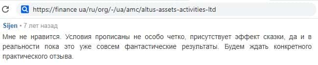 Вдумчивый инвестор финансовой компании по доверительному управлению инвестиционными активами Альтус Ассетс Активитис (Altus Ua) в своем отзыве на информационно-аналитическом веб-ресурсе finance ua выражает свою озабоченность и неудовлетворенность информацией, размещенной на сайте этого брокера.