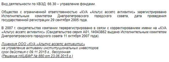 Согласно информации, размещенной на сайте компании по управлению инвестициями Альтус Ассетс Активитис, она зарегистрирована и затем перерегистрирована Исполнительным комитетом Днепропетровского городского совета 11 октября 2007 года (Свидетельство серия А01, №043862), но скринов с оригиналов этого Свидетельства и Лицензии на право деятельности на сайте не представлено.