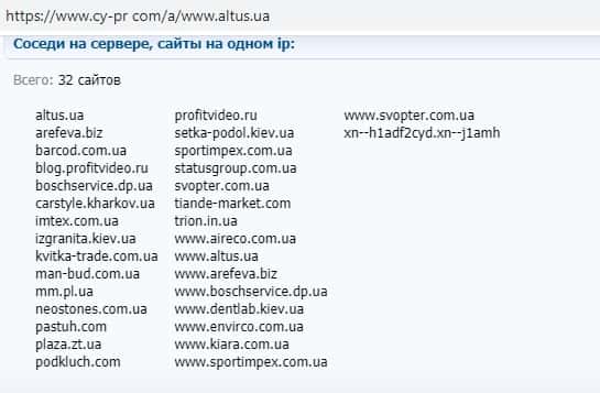 Информационно-аналитическим интернет-ресурсом cy-pr com при проверке домена сайта компании по управлению активами Altus Uа установлено, что уникальный сетевой IP-адрес домена, отнюдь не уникален, а принадлежит большому количеству пользователей, что сильно затруднит идентификацию и определение местоположения сайта в интернет-пространстве.