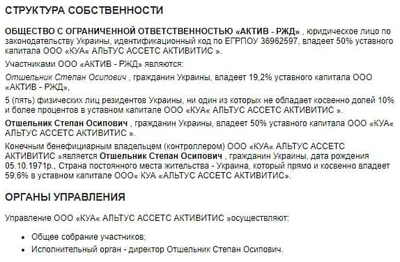 Согласно информации, размещенной на сайте Altus Ua, руководителем и владельцем 50% уставного капитала Общества с ограниченной ответственностью «Компания по управлению активами «Альтус ассетс активитис» является Отшельник Степан Осипович, он же совладелец 19,2% уставного капитала ООО «АКТИВ - РЖД», еще в команде управленцев этой конторы числятся 5 физических лиц резидентов Украины.