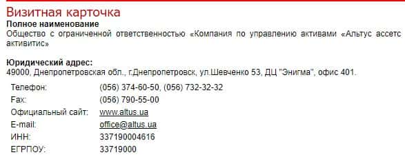 Для связи с партнерами и клиентами на сайте Общества с ограниченной ответственностью «Компания по управлению активами «Альтус ассетс активитис» Altus Ua размещена не просто контактная информация, а целая Визитная карточка, где указаны реквизиты этого брокера: