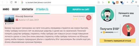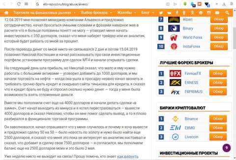 На портале ру брокерс бест находится страница, которая сделана для того, чтобы люди могли оставить отзыв и дать общую оценку работе с сервисом-лохотроном Алвексо. На данном сайте находится всего лишь один отзыв, который можно назвать правдивым, так как человек видно писал от всей души и с искренностью, та и правду они писал, это видно с самых первых строк его отзыва.