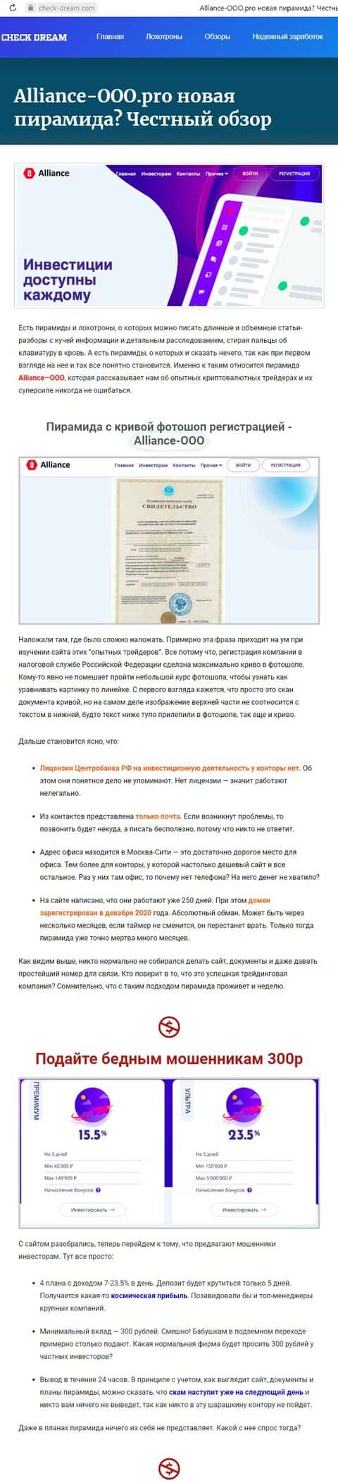 Брокеры Альянс ООО - пирамида с кривой фотошопрегистрацией, отмечают на сайте check-dream com.