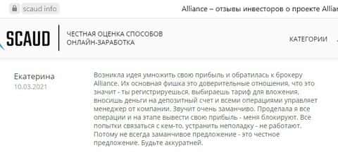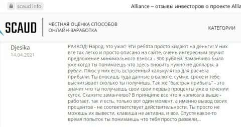 Вывести все вложенные в лоховозку Альянс ООО средства у вас не получится, - предупреждает следующий пользователь, которая попалась на уловки этих ушлых пройдох.