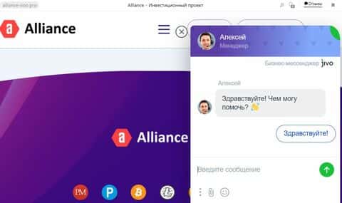 Кроме этого, для вида, работает онлайн-чат, где ушлые аферисты Альянс ООО обрабатывают своих жертв, распевая песни про высокодоходность их лоховозки.