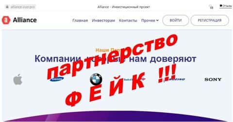 С целью пустить пыль в глаза и хоть как-то привлечь пользователей на свой мутнопроект, проходимцы Альянс ООО заявляют о своем партнерстве с известными брендами. Вот только ни одна из компаний не ведает об этих выскочках.